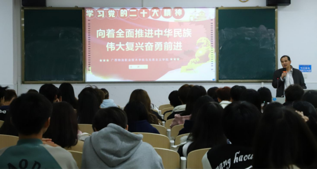 学校领导围绕党的二十大主题和主要成果、过去五年的工作和新时代十年的伟大变革、马克思主义中国化时代化新境界、新时代新征程中国共产党的使命任务、以中国式现代化推进中华民族的伟大复兴、全面建设社会主义现代化国家的目标任务、坚持党的全面领导和全面从严治党等七个方面,并结合壮美广西的发展,对党的二十大精神作了系统的宣讲。