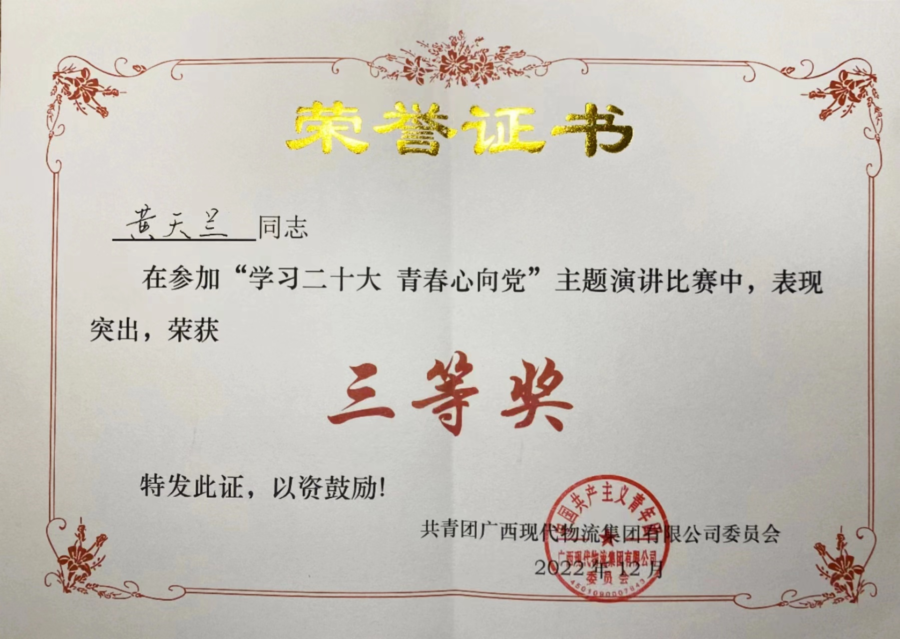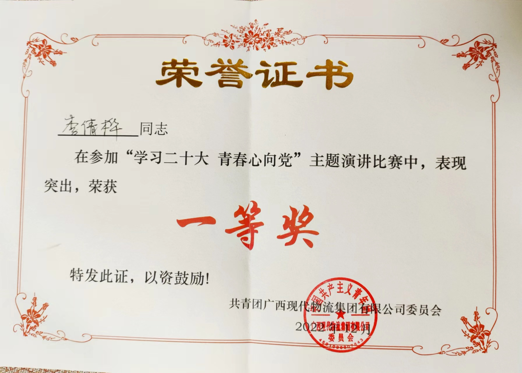 2022年12月16日,“学习二十大  青春心向党”——广西现代物流集团学习二十大精神演讲比赛暨桂物青年主题团日活动在集团孵化中心6楼图书馆举行,pp电子选派人文教育学院李倩桦、黄天兰两位老师参赛,并分别荣获比赛一等奖(第一名)、三等奖荣誉。