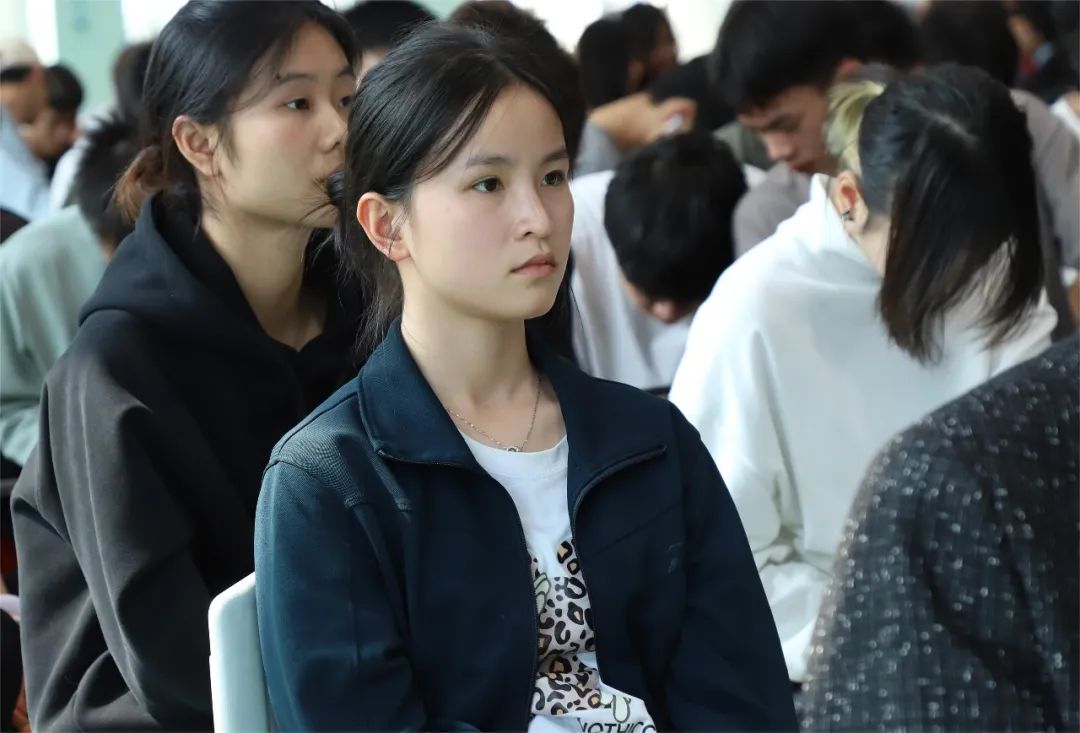 学校在家的领导班子成员、全体教职工、学生代表在主会场聆听授课,其余学生通过直播收听收看。