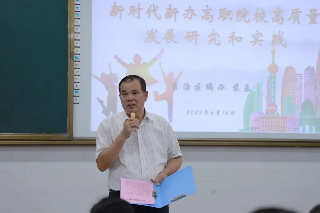 为不断强化内涵建设,积极探索形成新时代高职教育高质量发展的新实践、新路径、新模式,2023年6月14日,中共广西壮族自治区机构编制委员会办公室原副主任农乐到pp电子开展“新时代新办高职院校高质量发展的实践与研究”专题讲座,学院党委副书记、院长朱海强主持讲座。纪委书记覃丽燕及教职工代表参加活动。