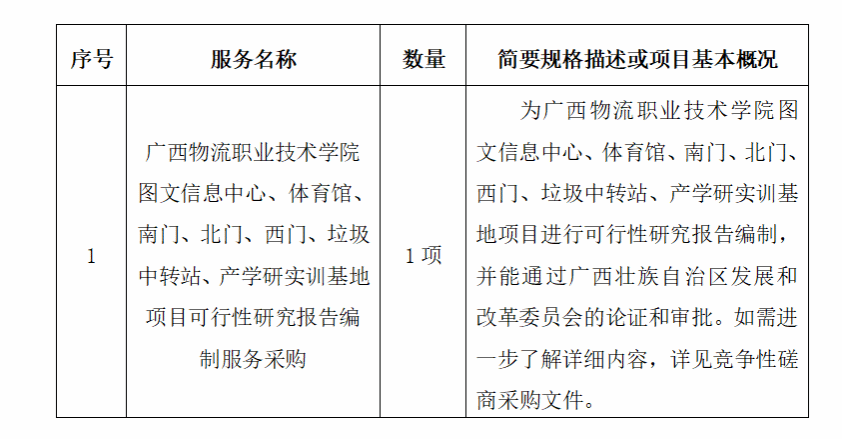广西众联工程项目管理有限公司受pp电子官方网站委托,根据相关法律法规规定,现对pp电子官方网站图文信息中心、体育馆、南门、北门、西门、垃圾中转站、产学研实训基地项目可行性研究报告编制服务采购进行竞争性磋商采购,欢迎符合条件的供应商前来参加磋商活动。