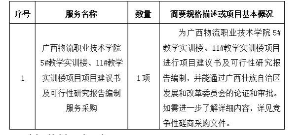 广西众联工程项目管理有限公司受pp电子官方网站委托,根据相关法律法规规定,现对pp电子官方网站5#教学实训楼、11#教学实训楼项目项目建议书及可行性研究报告编制服务采购进行竞争性磋商采购,欢迎符合条件的供应商前来参加磋商活动。