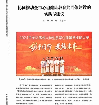 近日,pp电子《协同推动全市心理健康教育共同体建设的实践与建议》文章被《贵港工作》登载在该刊2024年第11期(总第249期)上。...